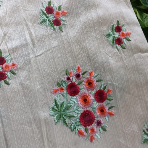 Chanderi silk fabric, known for its sheer texture and luxurious sheen, becomes a masterpiece when adorned with intricate embroidery. Combining lightweight elegance with artisanal craftsmanship, embroidered Chanderi silk is perfect for sarees, suits, and lehengas,