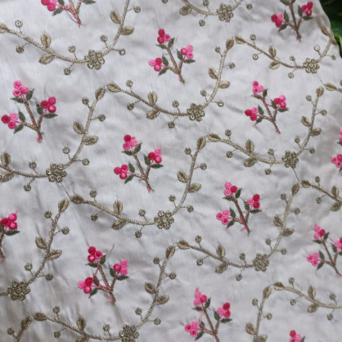 Chanderi silk fabric, known for its sheer texture and luxurious sheen, becomes a masterpiece when adorned with intricate embroidery. Combining lightweight elegance with artisanal craftsmanship, embroidered Chanderi silk is perfect for sarees, suits, and lehengas,