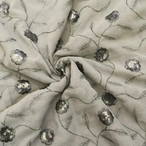 Georgette with embroidery work fabric known for its lightweight and flowing texture shines with intricate embroidery. Perfect for sarees, dresses, and dupattas, it combines elegance and craftsmanship, making it ideal for festive and formal wear.
