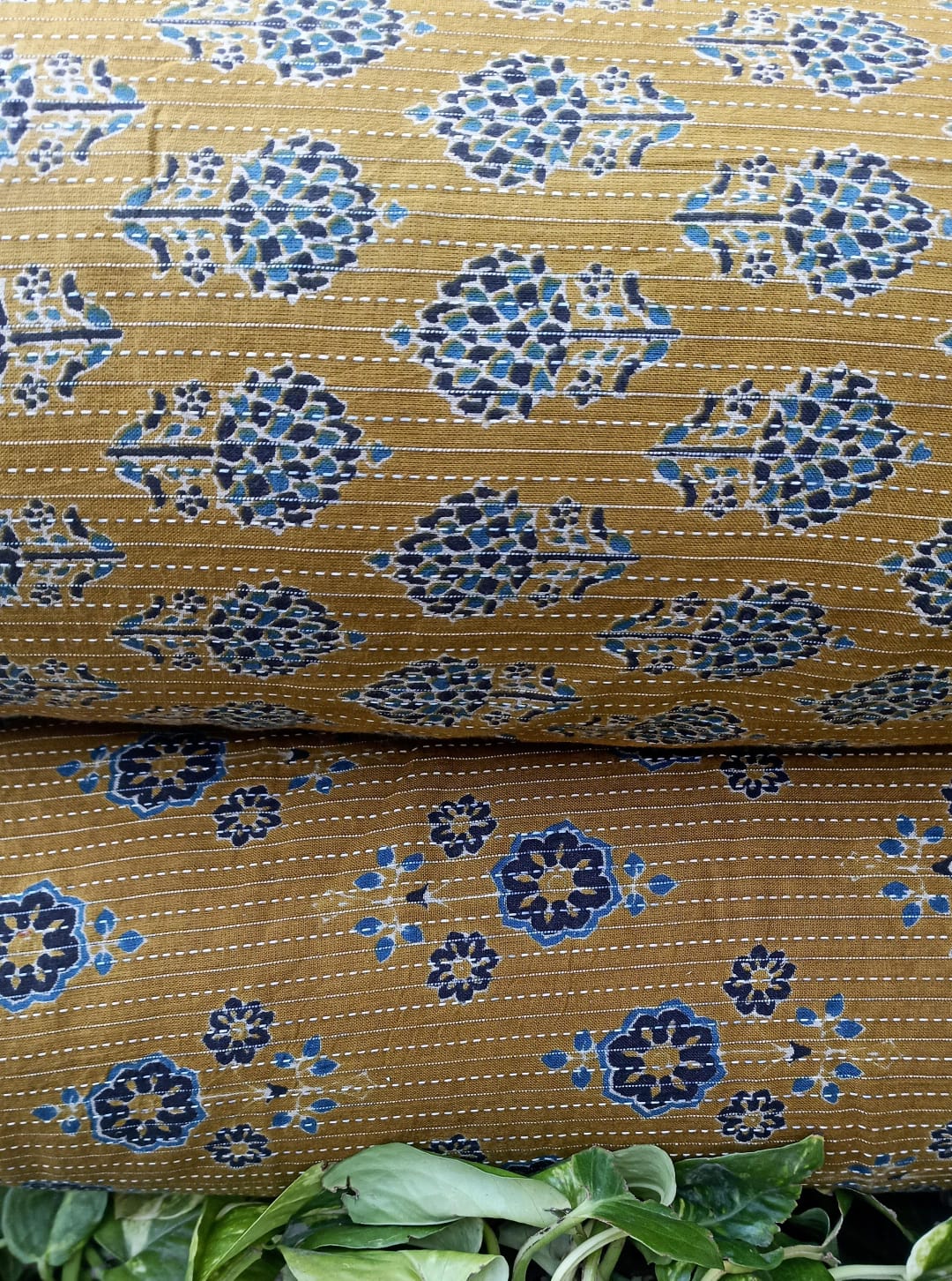 Katha printed Cotton fabric showcases intricate hand-stitched patterns, blending tradition with elegance. Known for its soft texture and vibrant designs.